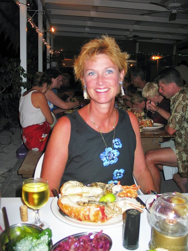 | Nancy with lobster dinner at the Anegada Reef Hotel | |