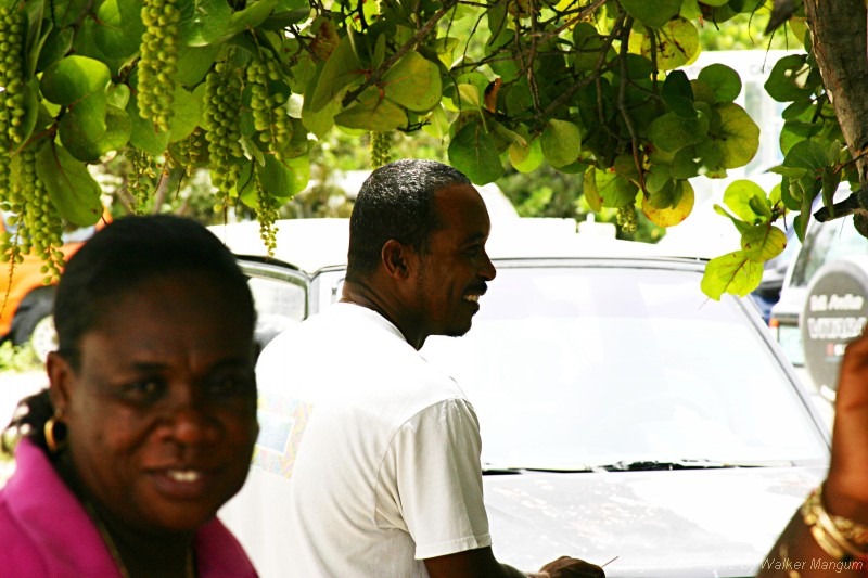 | Sue's yard sale. Dotsy in the pink. Garfield Faulkner under the seagrapes. | |