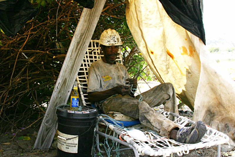 | Henry, Salt Island's sole worker. Henry makes the charcoal and gathers the salt. There is no electricity on Salt Island. We just gave him the packages batteries sitting in front of the beer for his only entertainment - his transistor radio. Since there is also no refrigeration, we also broght him the cold Carib. | |