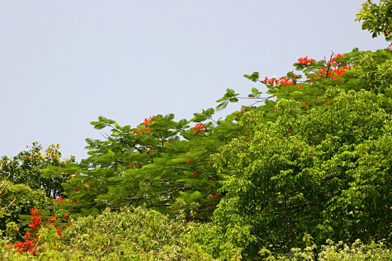 | "Flamboyant" trees on Cooper Island hillside. We have them growing at home from seed that we have brought back. | |