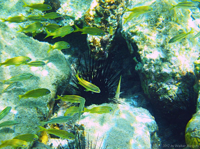 | Snorkeling at Cistern Rock - spiny urchin surrounded by fish. | |